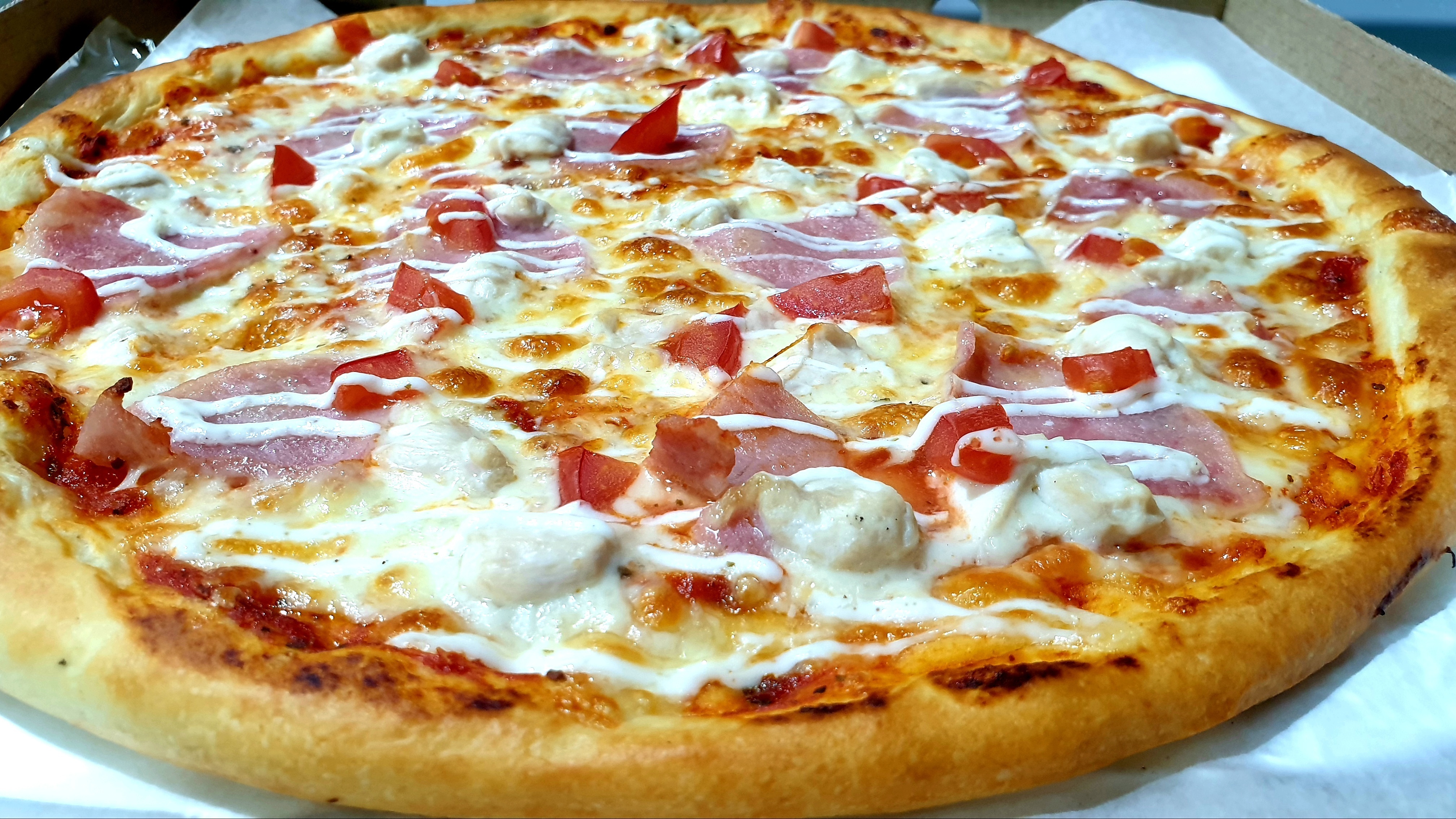 Двойная порция цыпленка,моцарелла,сыр чеддер и пармезан, сырный соус томаты, сливки, орегано